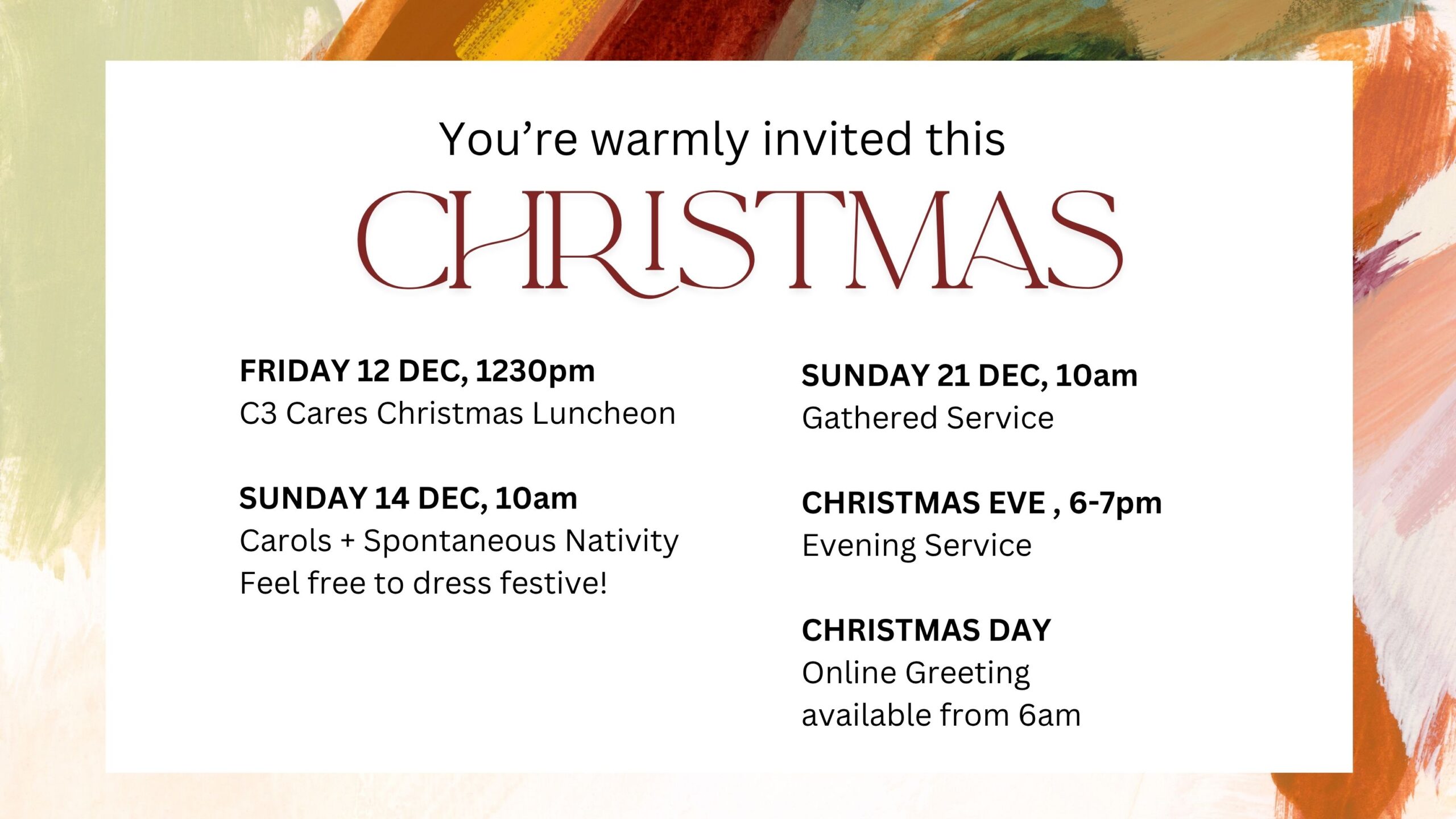 Summit Youth 14–15 Nov 2025 is our annual Summit Youth Event at C3 Belconnen. Friday Night: Outreach + Praise Party Saturday: Breakouts, ministry time, and extended worship. Rego your young people — their neighbours, cousins and mates! Let’s see them enter the new year filled with fire and purpose for Jesus.